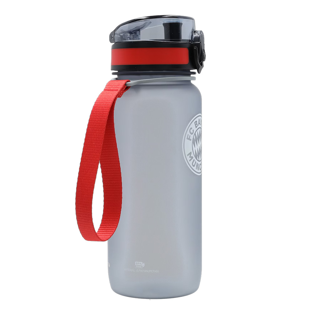 Na obrázku se nachází sportovní láhev s logem fotbalového klubu FC Bayern Mnichov. Logo na přední straně láhve je výrazné a detailně zpracované, což potěší každého fanouška tohoto slavného německého fotbalového klubu.