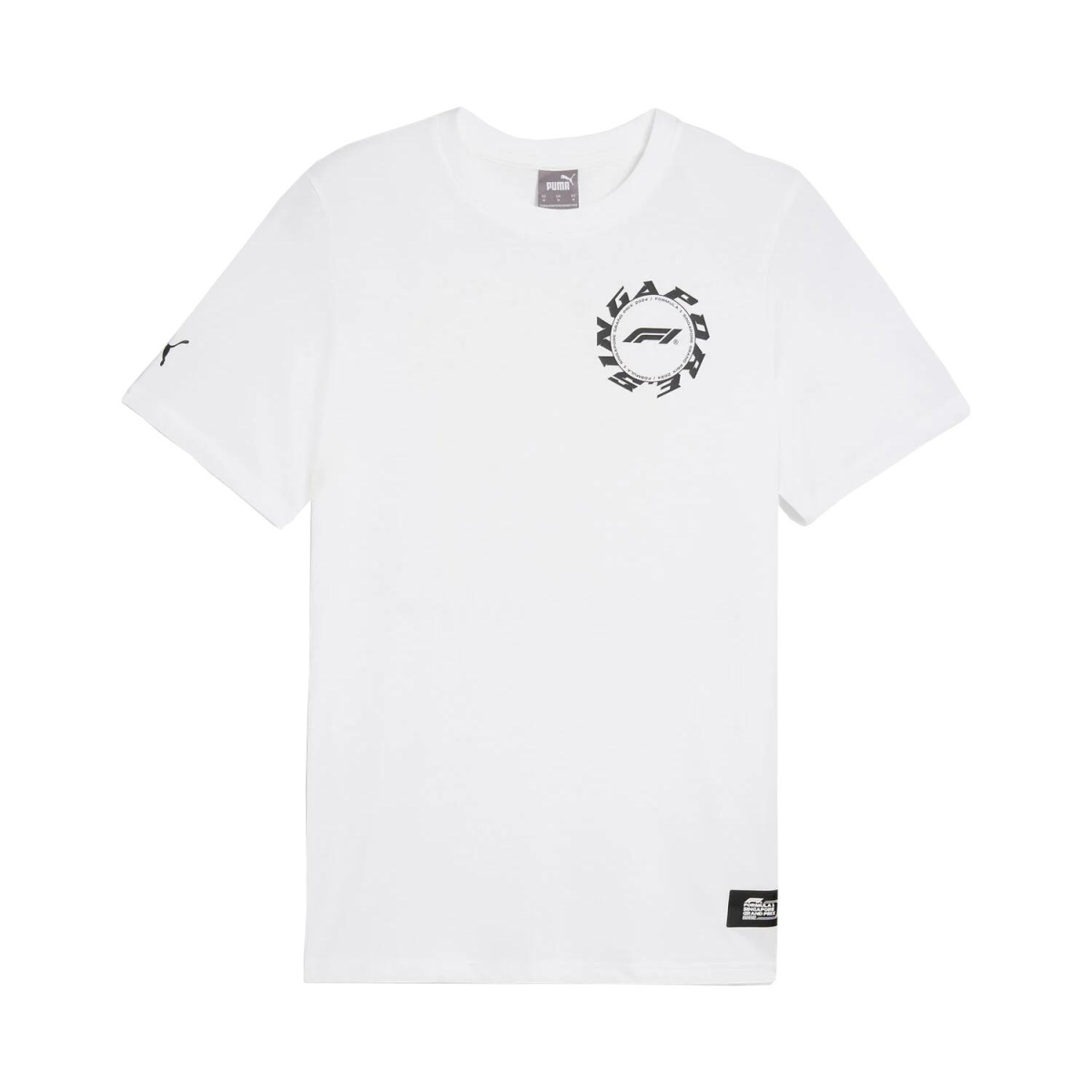 Obohaťte svůj šatník o bílé tričko značky Puma, ideální pro všechny fanoušky Formule 1. Toto stylové tričko má krátké rukávy a na levé straně hrudi se pyšní výrazným černým potiskem s textem Singapore a ikonickým logem Formule 1. Na levém rukávu najdete malé, ale elegantní logo Puma, které podtrhuje kvalitu a styl této značky.
