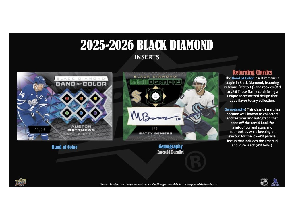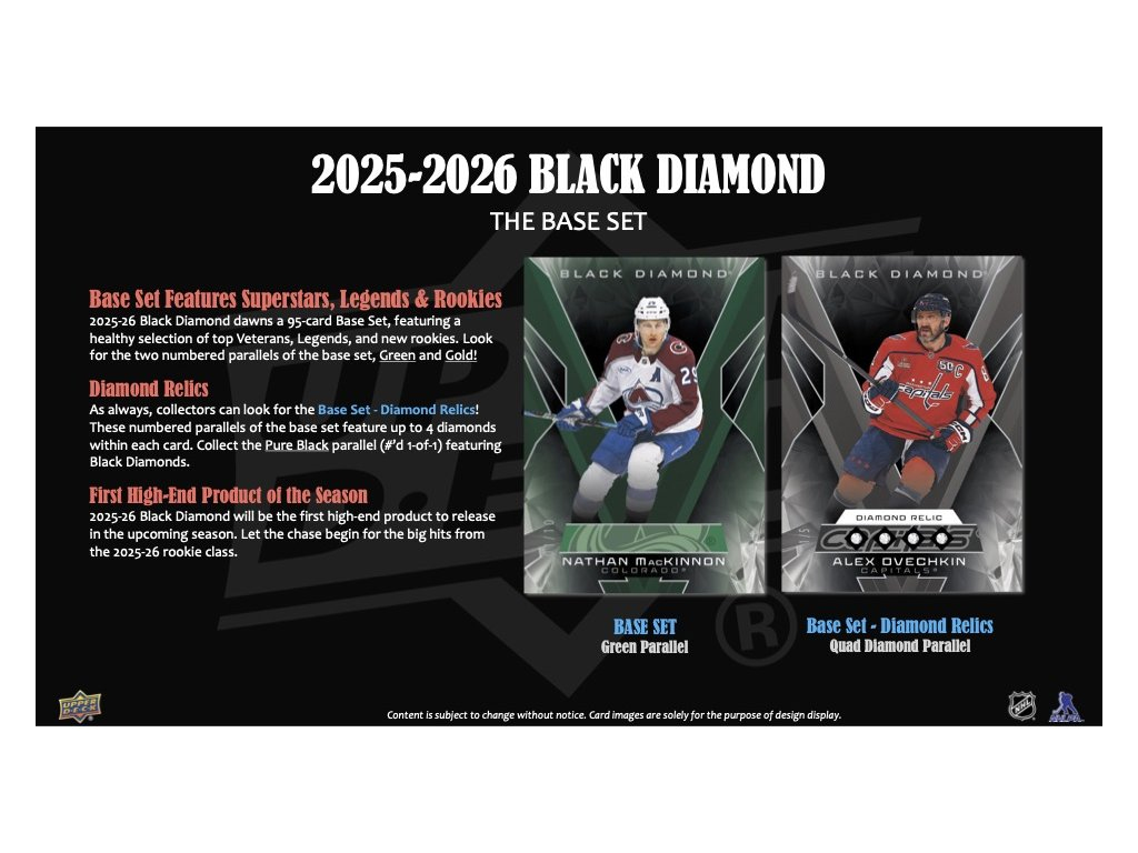 Nový Black Diamond obsahuje 95-kartový základní set s bohatým výběrem současných hvězd, legend a nováčků. Hledejte limitované paralelní karty Green (limitované do /10) a Gold (1/1).